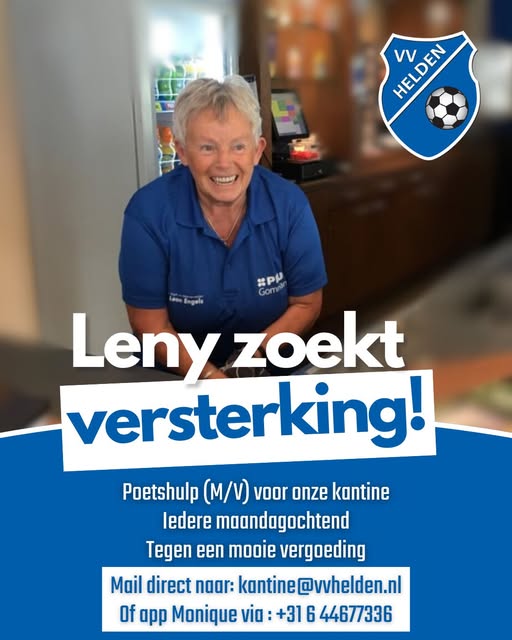 Voor onze gezellige en verbouwde kantine zoekt onze Leny versterking met schoonmaken.