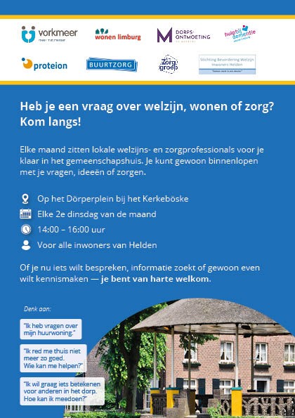 Vanaf nu kunnen inwoners van Helden elke tweede dinsdag van de maand terecht bij een laagdrempelig informatiepunt in het gemeenschapshuis op het Dörperplein bij het Kerkeböske. Tussen 14.00 en 16.00 uur staan lokale welzijns- en zorgprofessionals klaar om mee te denken over vragen, zorgen of ideeën.