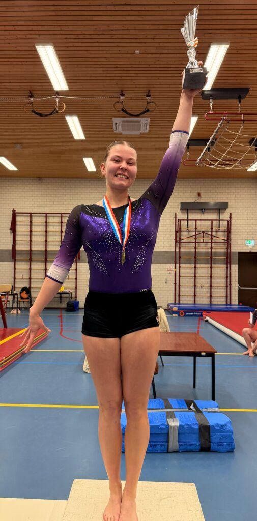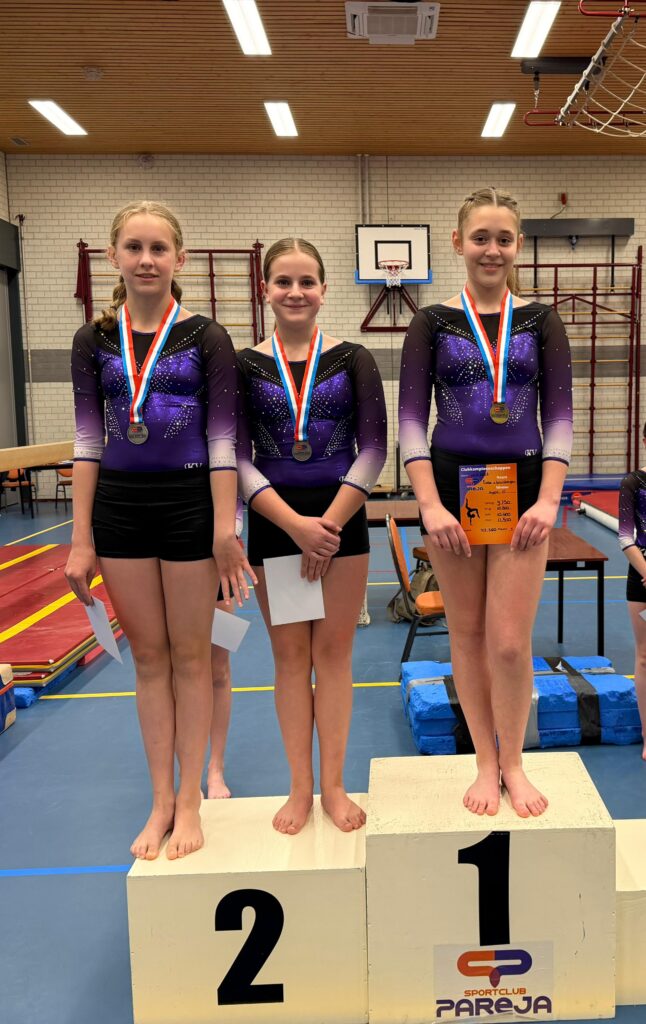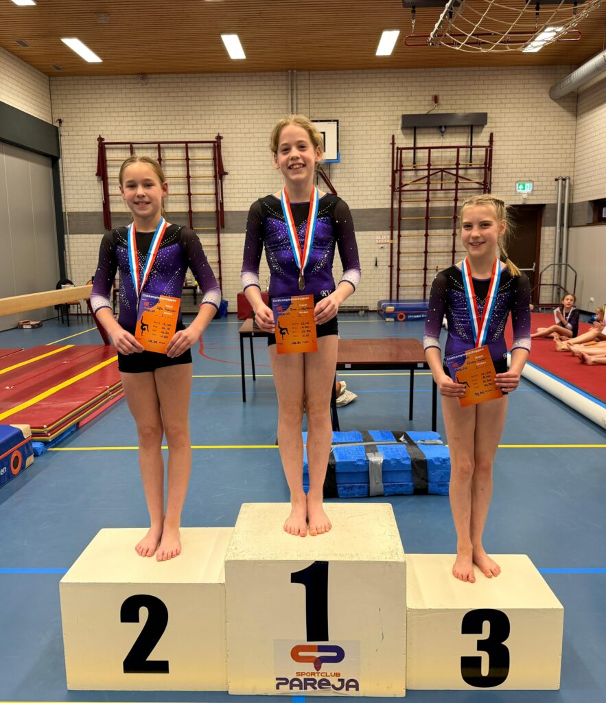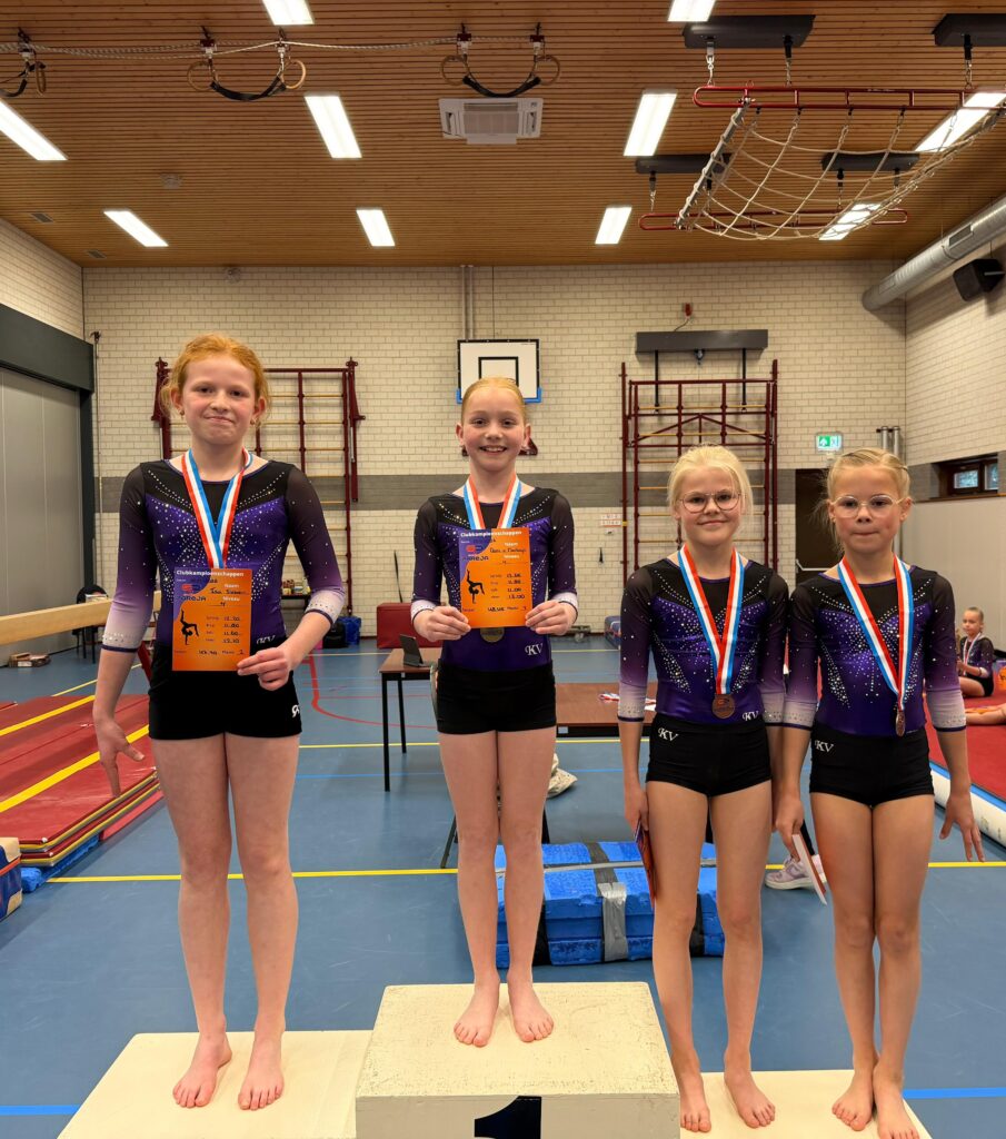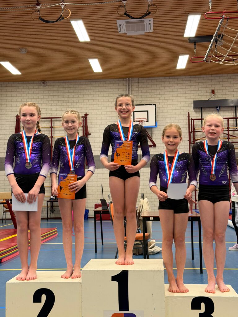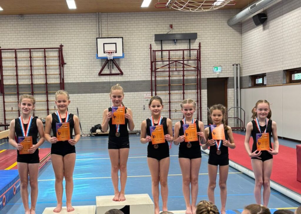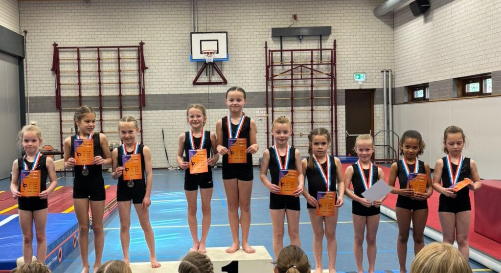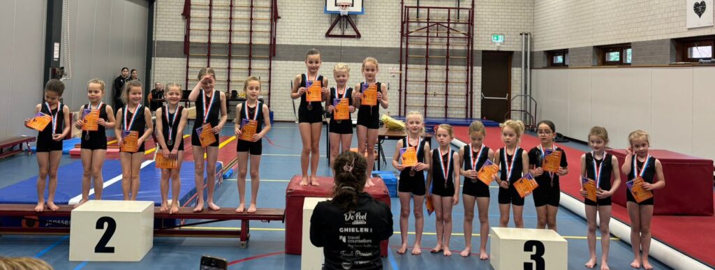 In de niveaus 3,4,5,6 hebben we allemaal turnsters en iedereen turnt in zijn eigen niveau de clubkampioenschappen. Iedereen kan een medaille behalen dus daar waren ze al superblij mee.